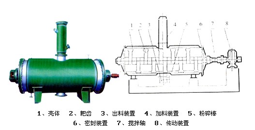 具有結(jié)構(gòu)簡單,操作方便,使用周期長,性能穩(wěn)定可靠,蒸汽耗量小,適用性能強,產(chǎn)品質(zhì)量好,特別適用于不耐高溫、易燃、調(diào)溫下易氧化的膏狀物料的干燥,該機經(jīng)用戶長期使用證明是一良好的干燥設(shè)備。原理:被干燥物料從殼體上方正中間加入,在不斷正反轉(zhuǎn)動的耙齒的攪拌下,物料軸向來回走動,與殼體內(nèi)壁接觸的表面不斷更新,受到蒸汽的間接加熱,耙齒的均勻攪拌,粉碎棒的粉碎,使物料表面水分更有利的排出,氣化的水分經(jīng)干式除塵器、濕式除塵器、冷凝器,從真空泵出口處放空。結(jié)構(gòu):真空耙式干燥機的主要部件。