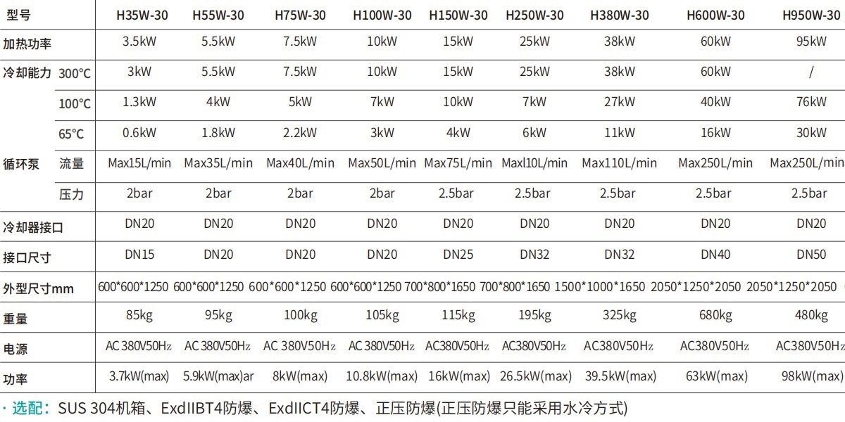 | 型號 | 加熱功率 | 冷卻能力 | 循環泵 | 冷卻器接口 | 接口尺寸 | 外型尺寸mm | 重量 | 電源 | 功率 | |||